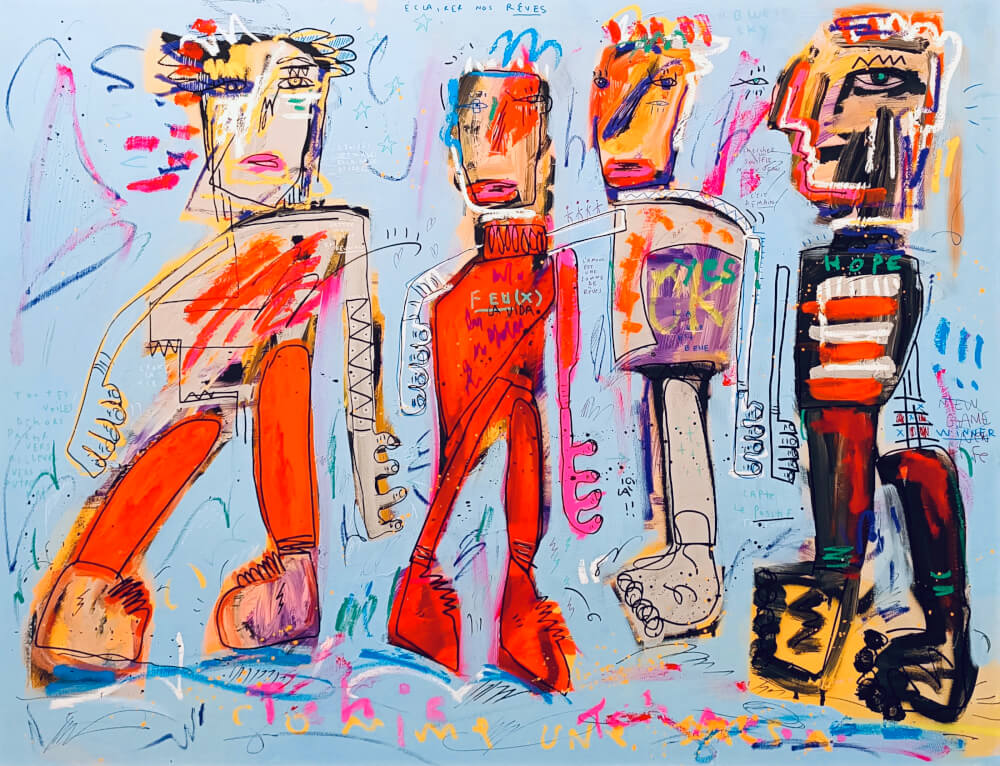 Jazzu, né à Toulouse en 1983, est un artiste contemporain autodidacte dont l'approche instinctive et sincère de la peinture fait de lui l'un des talents les plus passionnants du mouvement néo-expressionniste. Reconnu pour son style brut et expressif, les œuvres de Jazzu ont été exposées aux côtés d'artistes de renom comme Robert Combas et Speedy Graphito, consolidant ainsi sa place parmi les figures de proue de l'art contemporain. Ses peintures reflètent sans compromis une profonde connexion émotionnelle avec le monde qui l'entoure, alliant couleurs vibrantes, textures superposées et gestes dynamiques pour créer des œuvres qui résonnent à la fois sur le plan personnel et universel.